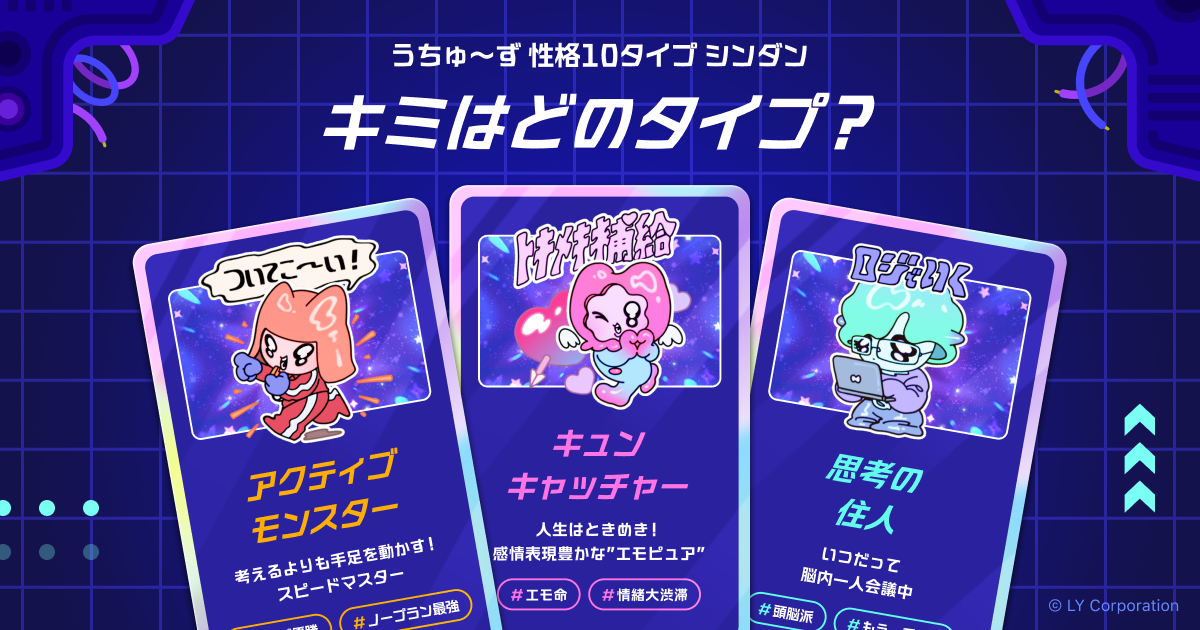 LINEヤフー株式会社(以下、LINEヤフー)が運営する占いサービス「LINE占い」にて、新キャラクター「うちゅ〜ず」と一緒に楽しめる新コンテンツ「性格10タイプシンダン」の提供を開始しました。診断はすべて無料で、16問の簡単な質問に答えるだけで、全10タイプの中から自身の性格タイプを導き出します。
