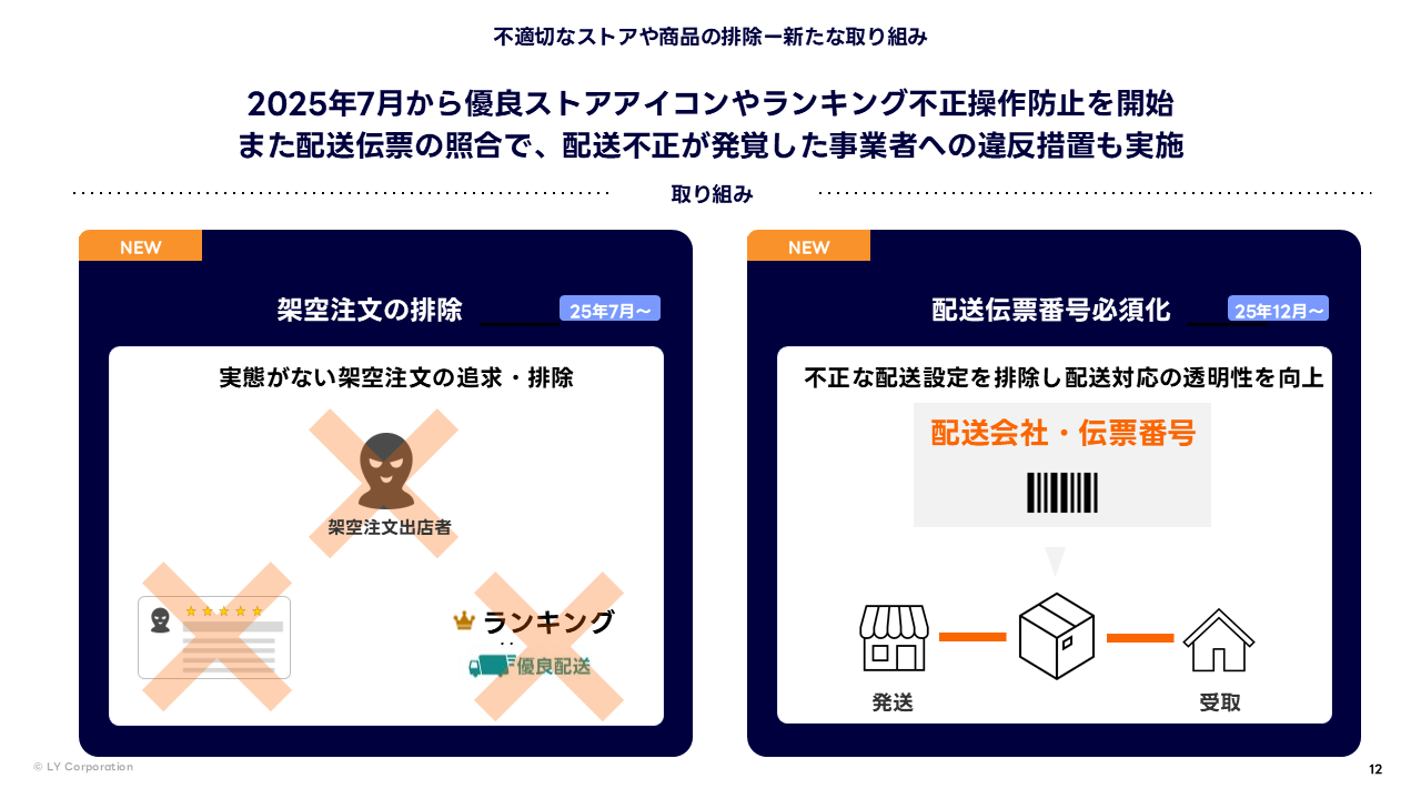 2025年7月より、実態のない注文を繰り返すことで、正常に運営を行っている出店者に不利益を与える悪質な事業者の排除や、優良ストアアイコンやランキングの不正操作を防止する対策を開始しました。これにより、架空注文などを通じて不正に評価や表示順位を操作する行為を抑止し、公平・公正な取引環境の維持を図っています。