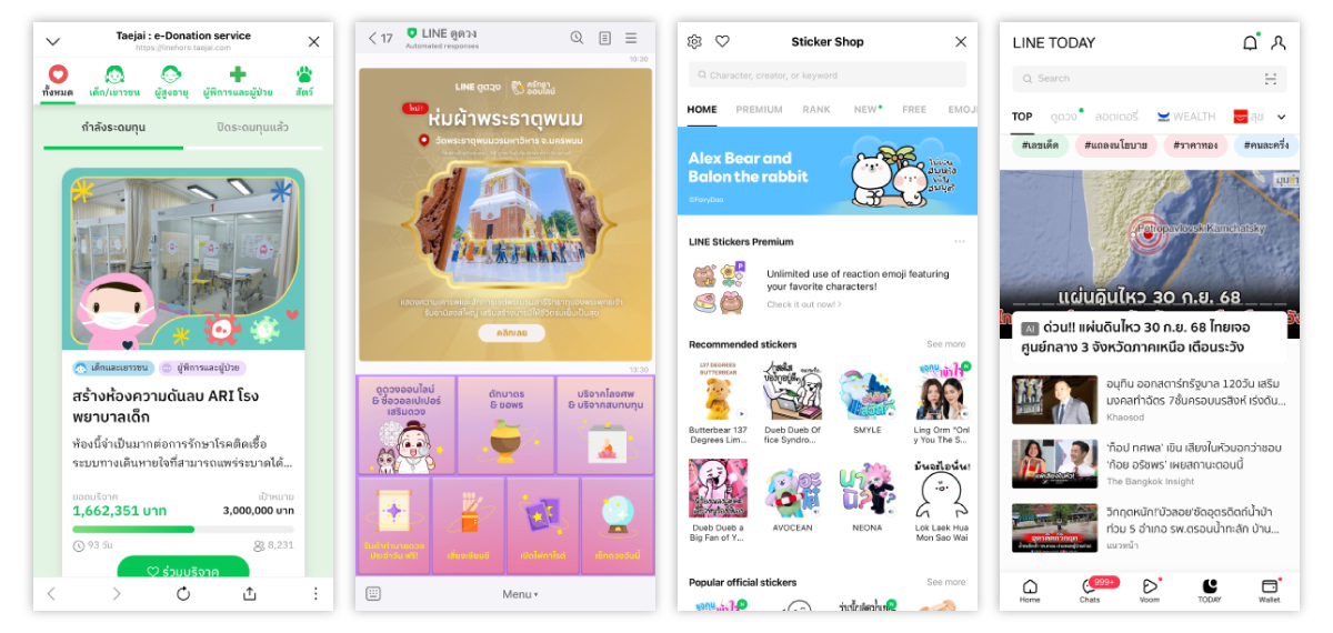 左からLINE Horoの願掛けサービスと寄付サービス、タイ人クリエーターによるLINEスタンプ、LINE TODAYのサービス画面